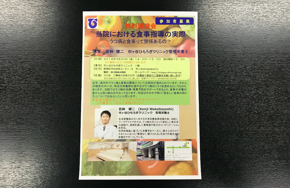 3月30日無料講演会のお知らせ「当院における食事指導の実際ーうつ病と食事って関係あるの?」若林健二氏