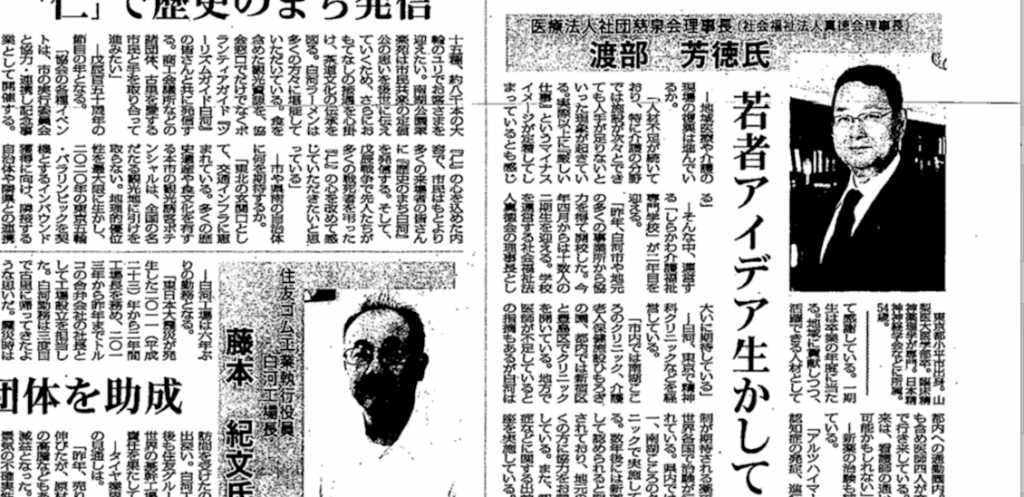 2018年3月27日「福島民報」朝刊【企画特集】ページの白河市提言特集に、渡部理事長の記事が掲載されました。ひもろぎグループの拠点である福島県白河市で運営している「しらかわ介護福祉専門学校」での取り組みや、南湖こころのクリニック、介護老人保健施設ひもろぎの園、新宿区と豊島区のクリニックに関する紹介と、新薬の治験など共に、白河市への提言が述べられています。ぜひご覧下さい。