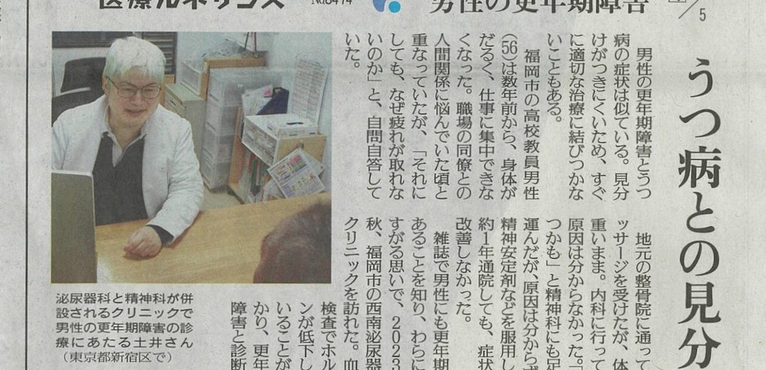 男性の更年期障害を取り上げた当記事は、「うつ病との見分け難しく」との見出しで、精神科から泌尿器科に紹介されてくる例や更年期障害とうつ病を併発するケースなどを紹介。土井先生は、泌尿器科と精神科が併設されているクリニックで診療する医師として、「男性更年期障害は、精神科と泌尿器科が連携して治療にあたることが重要。メンタルの不調がある場合には、泌尿器科の受診を検討してみては」と語りました。