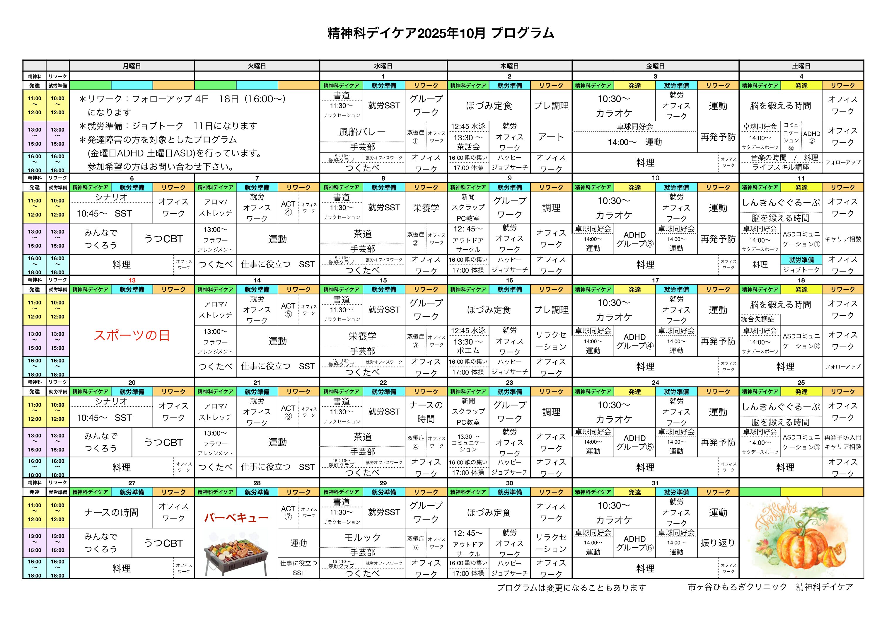 市ヶ谷ひもろぎクリニック・精神科デイケアの2025年10月のプログラム表をアップしました。10月の目玉イベントは「バーベキュー」!場所は昨年に引き続き、葛西臨海公園です。ぜひご参加ください。